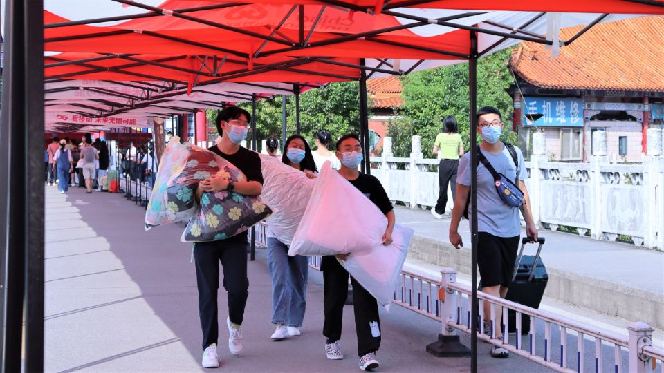 为更好地进行这两天的迎新工作,在这之前我院提前安排好各组织工作人员的迎新工作。在迎新工作进行时,工作人员各司其职,有序为新生提供良好的迎新服务,此次迎新工作,我院团总支、学生会、通讯社、心理健康协会等组织积极参与其中,各组织工作人员有序热情,充分发挥学生干部乐于助人、坚守岗位的奉献精神,营造出“平安、有序、热情、周到”的报到氛围,让新生感受到学院的温暖。工作人员帮助新生搬行李,新生入寝变得更加轻松。此外,我院党总支书记邓顺松、团总支书记陈杰以及各专业新生班主任积极投身于迎新工作之中,各新生寝室楼栋也随处可见他们的身影,对新生表达关怀与慰问。此次迎新依然坚持疫情防控常态化,部分新生在官方公众号事先对报到注意事项有所了解。为保障学生安全,我校特在火车站设立报到点,报到完成后可乘坐大巴车从火车站直达宿舍,有效减轻新生的负担。
