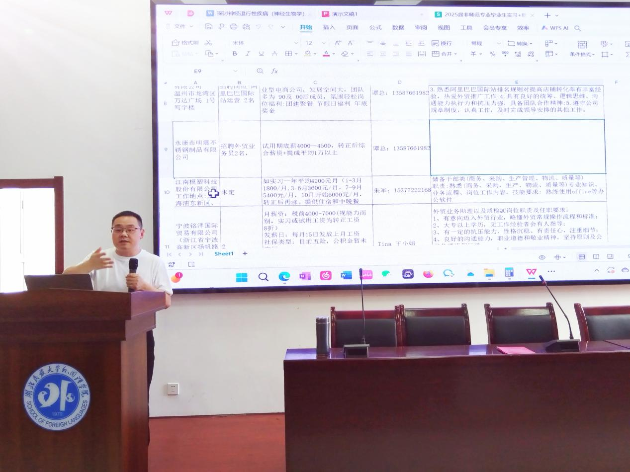 与时代同心同力,让青春绽放光芒。首先 ,王军老师基于大环境展开剖析,立足时代根基,指明实习实训的关键意义。通过实例,他建议同学们务必全方位衡量自身的实力状况,从而确定贴合实际的发展目标。然后,他详尽阐述了实习政策并提出相关要求,并重点向同学们介绍了 19 个集中实习单位,以增进同学们对企业的了解,明确自身的职业规划。