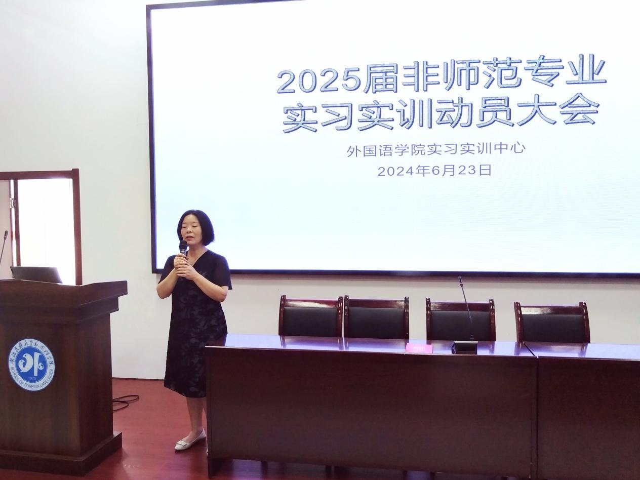 实习新征程,助力未来梦,为了让同学们认识到目前就业形势,树立正确的就业价值观,确保我院2025届毕业生实习就业工作顺利开展,6月23日,我院于6402学术报告厅举行了“2025届非师范专业实习实训动员大会”,外国语学院党总支书记罗成富,实习实训中心主任王军,学生科科长向绍阳,商务英语系主任秦为民和日语系主任郝良燕出席本次活动,汪义军主任担任活动主持人。21级翻译专业、商务英语专业和部分日语专业同学参与了本次活动。
