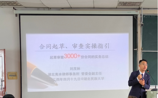 4月19日,湖北夷水律师事务所管委会副主任刘茂林律师为我院学生讲授“合同起草、审查实操指引”课程。我院教师李建忠担任主持人。
