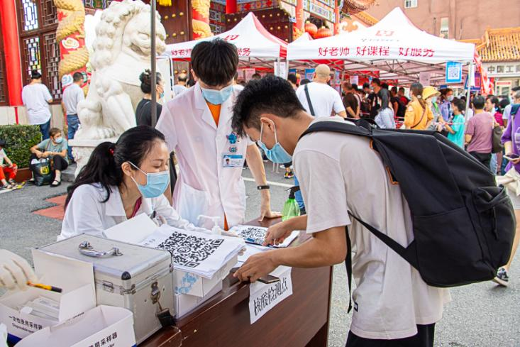 在校门口,新生需持48小时核酸检测阴性报告及健康绿码和行程码进校。同时,考虑到部分学生未做核酸检测,学校设置了核酸检测点,分配专门的医护人员采取核酸检测样品。在学校大门进行核酸采样的附属民大医院的医务人员说:“现在疫情形势依然严峻,学校与民大医院相互配合确保新生的生命健康安全,保证顺利开学。”进行检测后,学生可通过手机扫码查询结果,方便快捷且极大地缩短了时间。