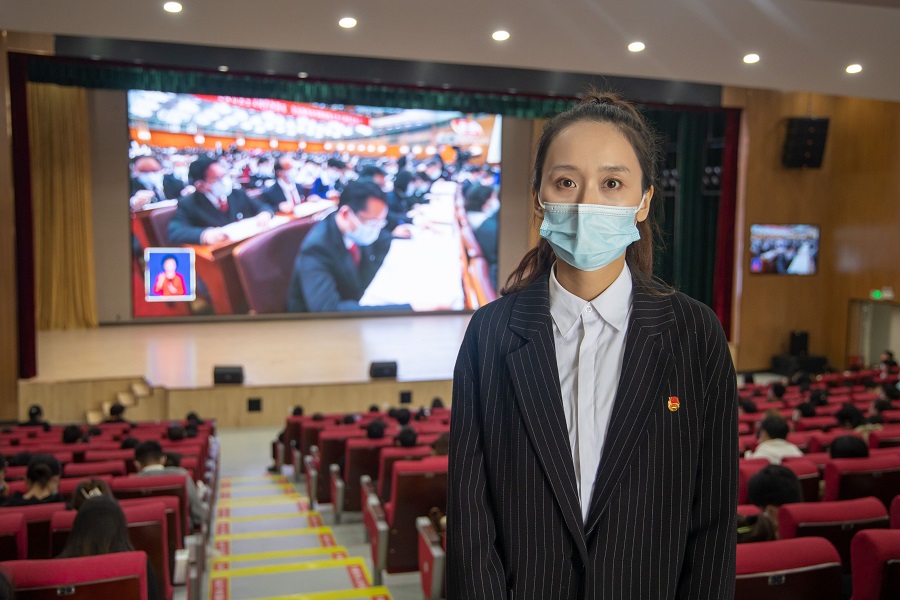 医学部学生、恩施市民口中的“00后大白”向思奇观看开幕会(李经玺 摄)