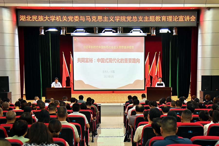 6月2日,fun88乐体育官网体育学习贯彻习近平新时代中国特色社会主义思想主题教育理论宣讲会在行政楼1号会议室举行。机关党委、马克思主义学院党总支举行主题教育联学活动,共同聆听学校党委副书记邓磊教授围绕“共同富裕”进行的主题宣讲。学校机关党委党员和马克思主义学院教职工、学生党员参加宣讲报告会。机关党委书记、党委组织部常务副部长洪雁主持宣讲会。