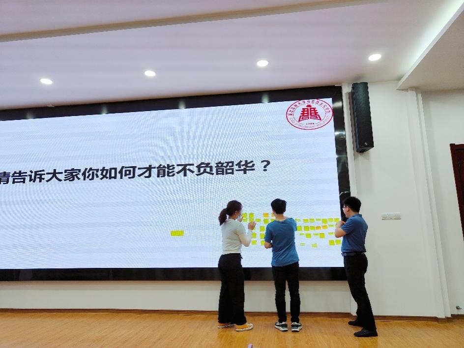 鲁帅以习近平总书记提出的“不负韶华,不负时代,不负人民”为主题,结合自身经历讲述时代发展的进程、自身的改变,让广大学生了解“时代”二字的含义,并通过播放展现近代中国无数先烈奋斗史的影片,从历史事件时间轴上阐述“时代”和“人民”的含义。活动中,鲁帅以在小纸条上写下答案的方式与研究生代表进行互动,共同探讨如何不负韶华,更好的立足当下,为人民服务,为广大研究生群体服务。