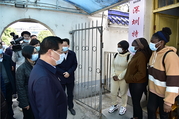 柯俊认真听取了我校关于学生错峰返校、用餐、住宿、管理、消杀演练等方面情况汇报,提出指导意见。在留观室和医务室,柯俊详细询问发热病人处置流程,对我校的应急预案给予充分肯定。他强调,要严格按照“一人一房一床一卫”的标准预备好留观室,宁可备而不用,不可用时无备。