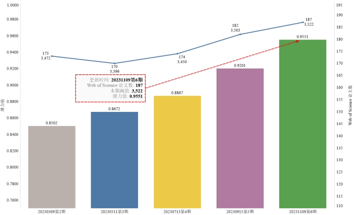 利用InCites对我校潜力学科Engineering工程学和Computer Science计算机科学2023年近5期的学科态势进行分析,见表3和表5。这两个学科的潜力值较上期均有一定幅度的增长。其中Computer Science计算机科学增幅较高。2023年11月Engineering工程学和Computer Science计算机科学进入ESI前1%潜力值分别为0.9551和0.9168。