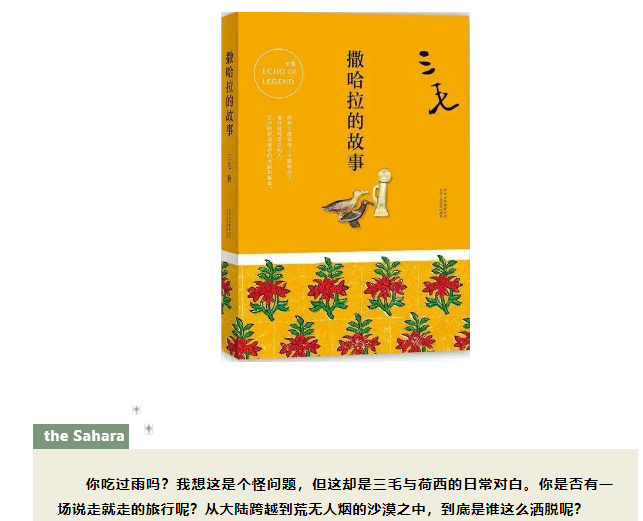 《撒哈拉的故事》由中国台湾当代女作家陈平(笔名三毛)所撰写,是一系列以记录沙漠生活为背景的故事。因为被年幼时看的一本地理杂志所吸引,长大后的三毛毅然背着行囊,独自一人步入了这荒凉孤寂的撒哈拉沙漠,在沙漠中寻找与感受生活的真、善、美,书中每个故事都充溢着一种浪漫、浓厚的异域风情,字里行间透露出大沙漠独有的地形地貌与风土人情,也流露出她对着片异国他乡土地的向往。