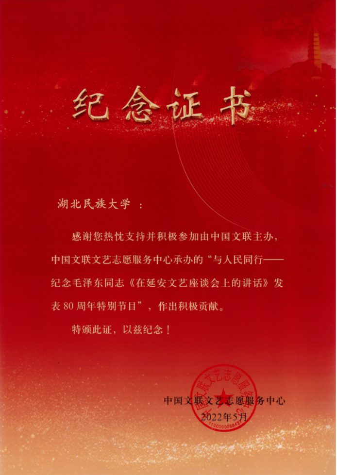 在毛泽东同志《在延安文艺座谈会上的讲话》发表80周年之际,中国文联、中国文联文艺志愿服务中心联合举办了“与人民同行”——纪念毛泽东同志《在延安文艺座谈会上的讲话》发表80周年特别节目。5月23日、由中国文联主办的“与人民同行”——纪念毛泽东同志《在延安文艺座谈会上的讲话》发表80周年特别节目在央视播出,我校受邀参加此次节目的录制,在歌舞节目《丰收中国年》《一起向未来》、合唱节目《到人民中去》《领航》充分彰显青春与活力,获得节目组导演的一致好评与观众认可,获得了节目组的表彰,给fun88乐体育官网体育颁发了纪念证书。