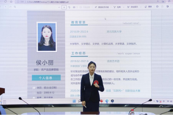 在个人展示环节,14名参赛选手结合个人简介、自身优势、专业技能、职业规划、求职意向等进行展示,给评委们留下了深刻印象。在无领导小组讨论环节,六号选手宋雪婷从“国家战略实施度的体现”和“舆论”两个角度出发,对题目中“十佳农民评选活动”进行深入分析,并给出了自己的判断。在职业测评环节中,数字智能及社会管理服务赛道的胡小亿通过“消费赞”阐述了他对“数字经济”的理解。选手们的精彩表现,赢得现场观众阵阵掌声。经过多轮比拼,侯小丽最终以92.38的高分摘得本次比赛桂冠。