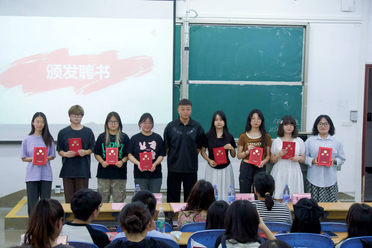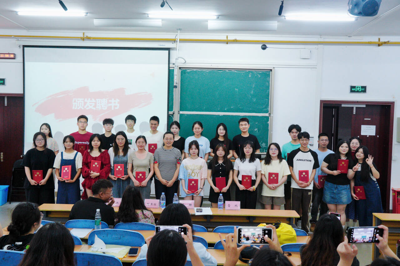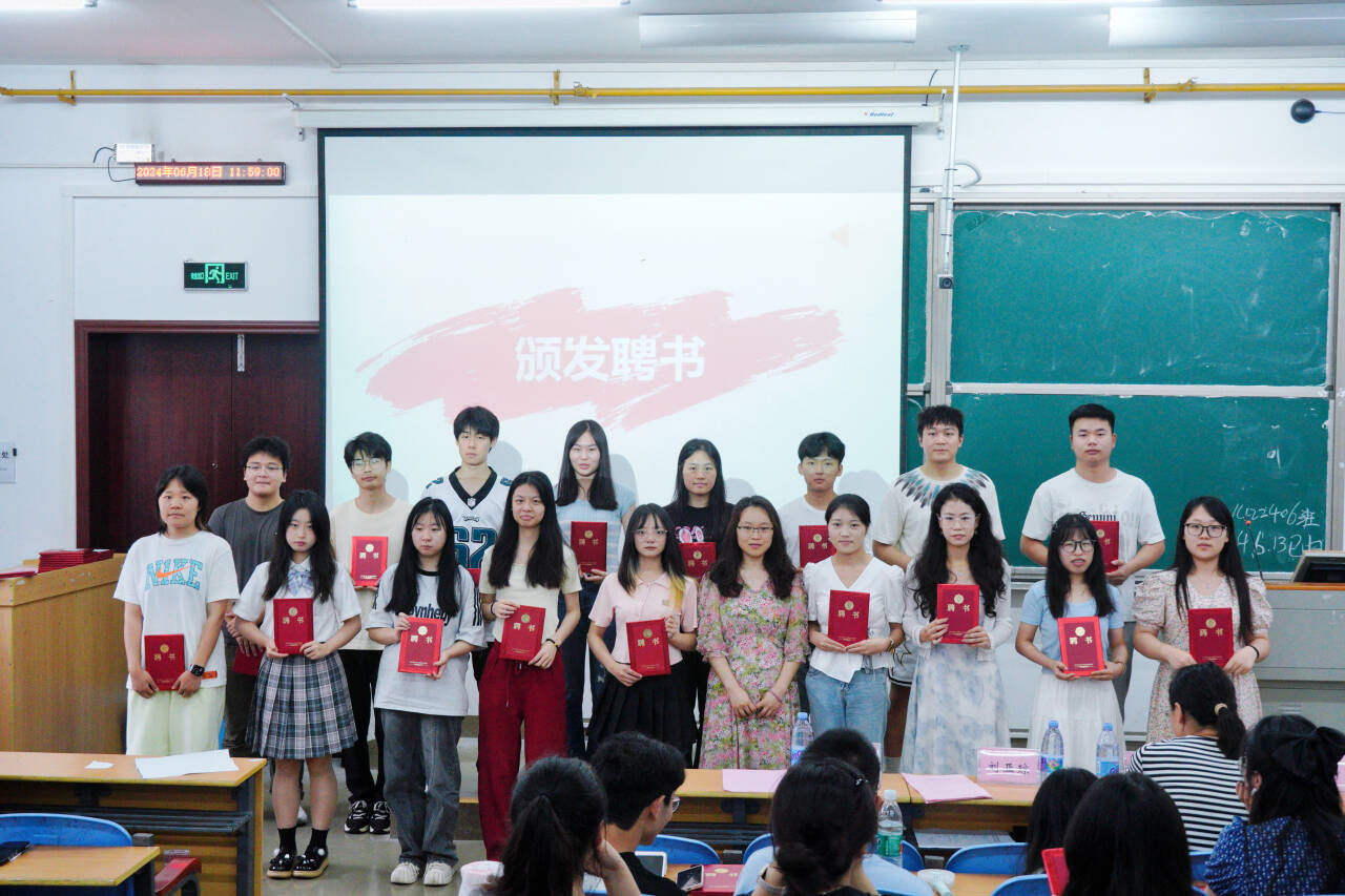 吴珊老师为校团委学生干部颁发聘书并合影留念