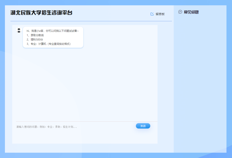 疫情当前,我们为爱隔离,虽不能见面,但始终惦念。为了方便广大考生及家长朋友们进行招生咨询,了解最新招生资讯,我校招生咨询智能问答系统正式上线,欢迎大家前来咨询!具体咨询方式如下: